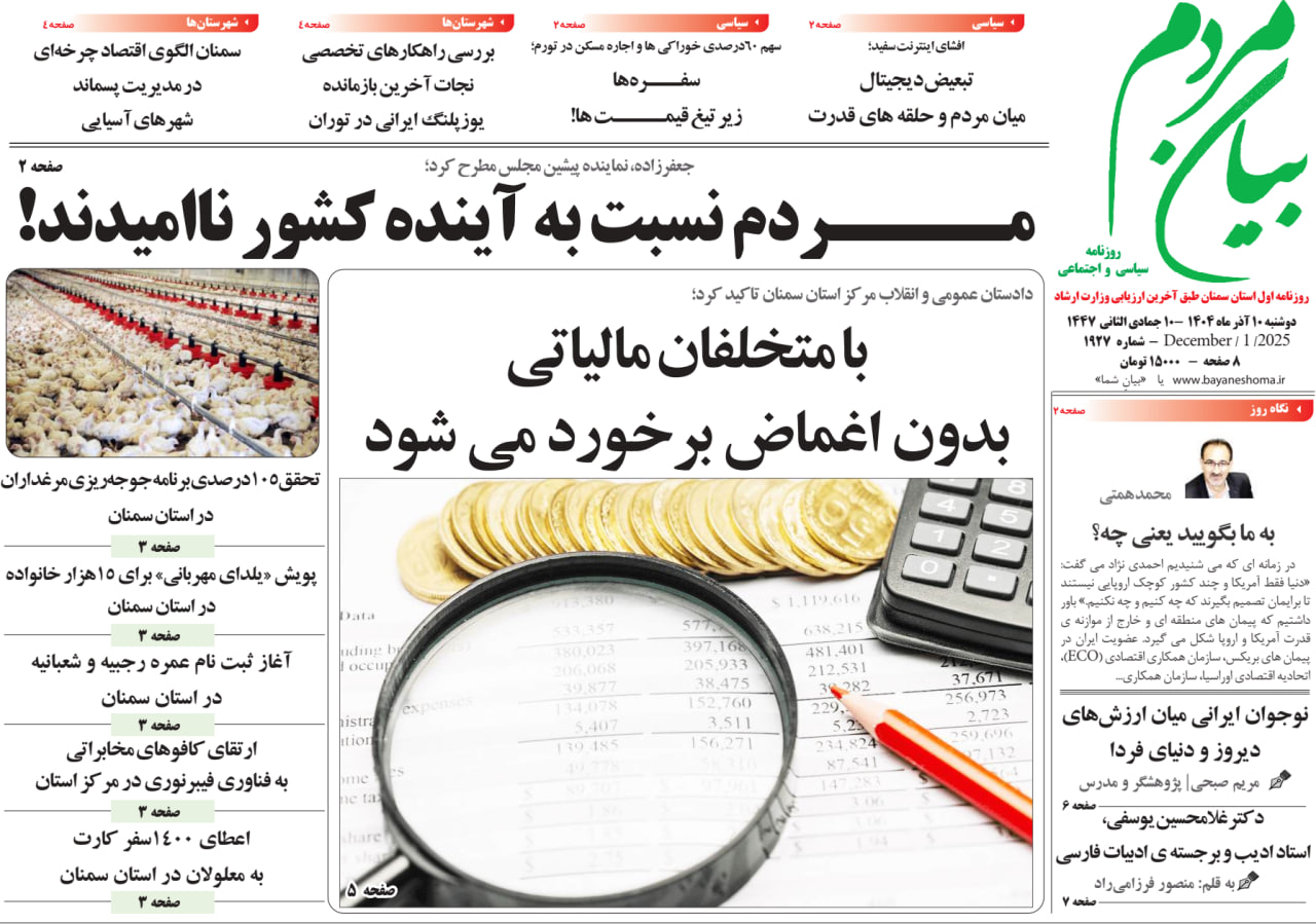 روزنامه بیان مردم1404/09/10 شناسه خبر: 17747 تاریخ و زمان ارسال: 10 آذر 1404 ساعت 11:13 روزنامه بیان مردم1404/09/10