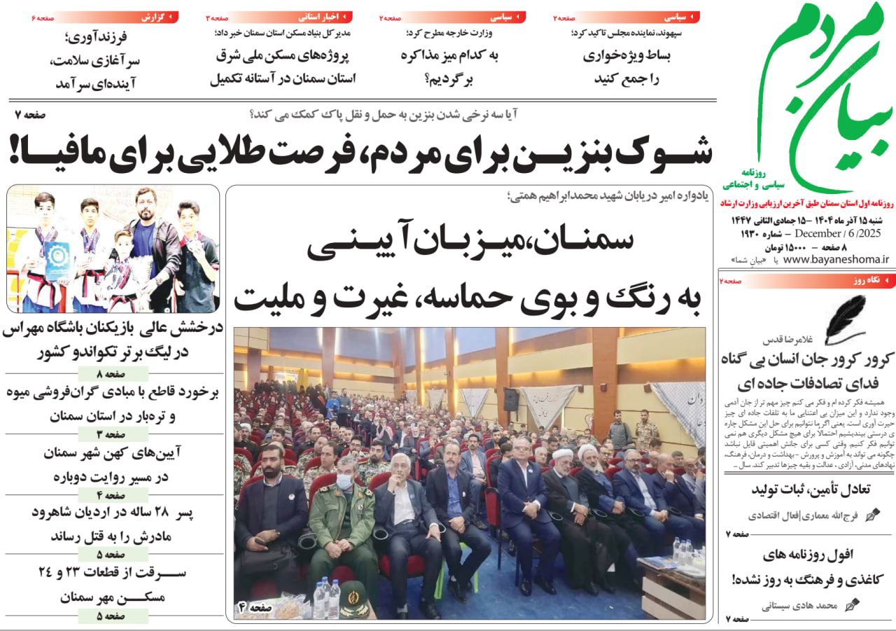 روزنامه بیان مردم1404/09/15 شناسه خبر: 17790 تاریخ و زمان ارسال: 15 آذر 1404 ساعت 11:02 روزنامه بیان مردم1404/09/15