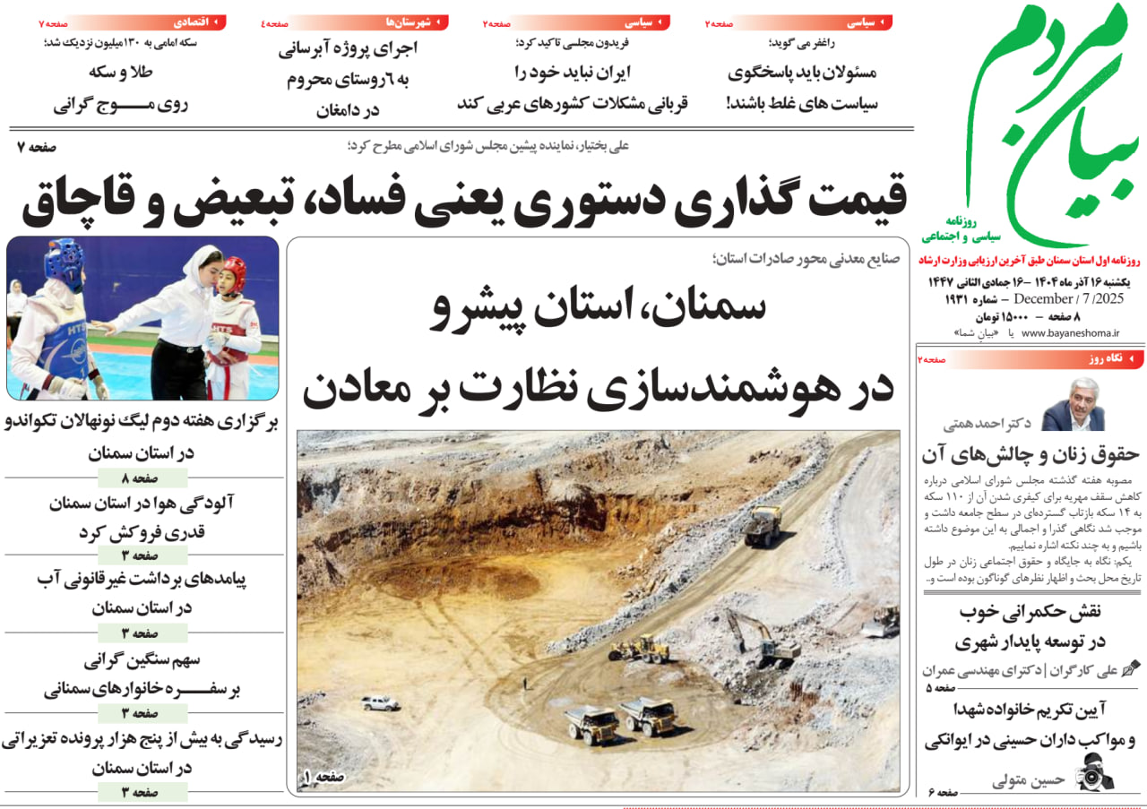 روزنامه بیان مردم1404/09/16 شناسه خبر: 17810 تاریخ و زمان ارسال: 18 آذر 1404 ساعت 11:34 روزنامه بیان مردم1404/09/16